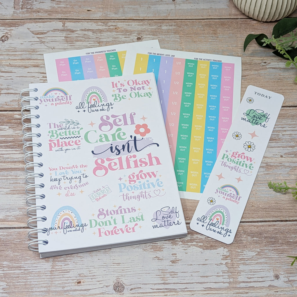 Premium – soft touch hardback covers with rear pocket, laminated bookmark, and three sticker sheets (on plan and off plan, jar increments, motivation)