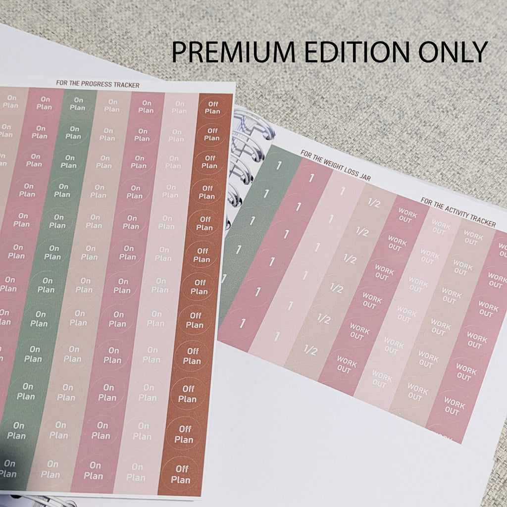 Premium – soft touch hardback covers with rear pocket, laminated bookmark, and three sticker sheets (on plan and off plan, jar increments, motivation)